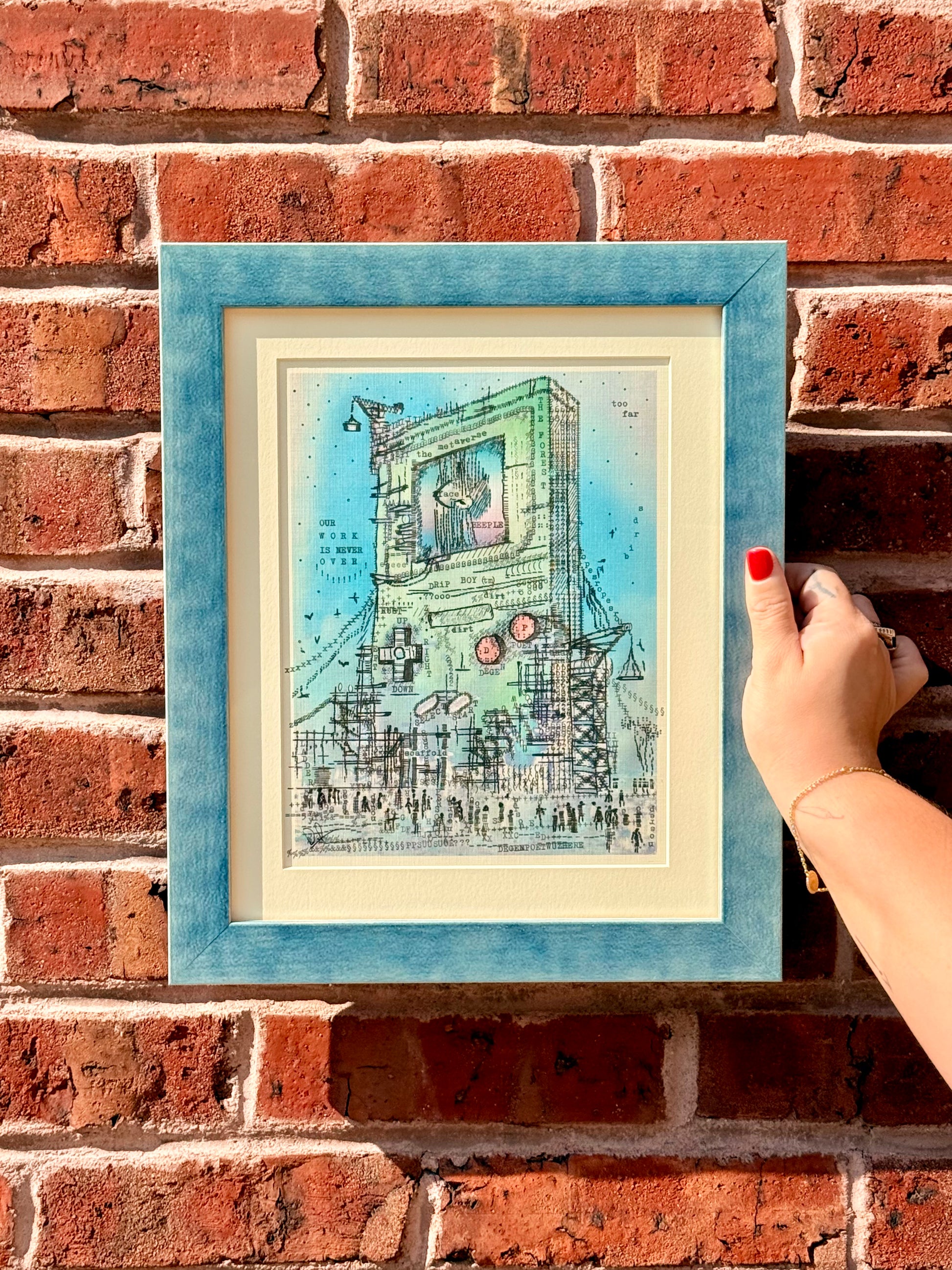 The piece will be custom framed upon order, with process photos posted to X. High-quality frames and mats are selected by the artist to complement the artwork. It's Protected by museum-quality Optimum Acrylic glass (UV-blocking).