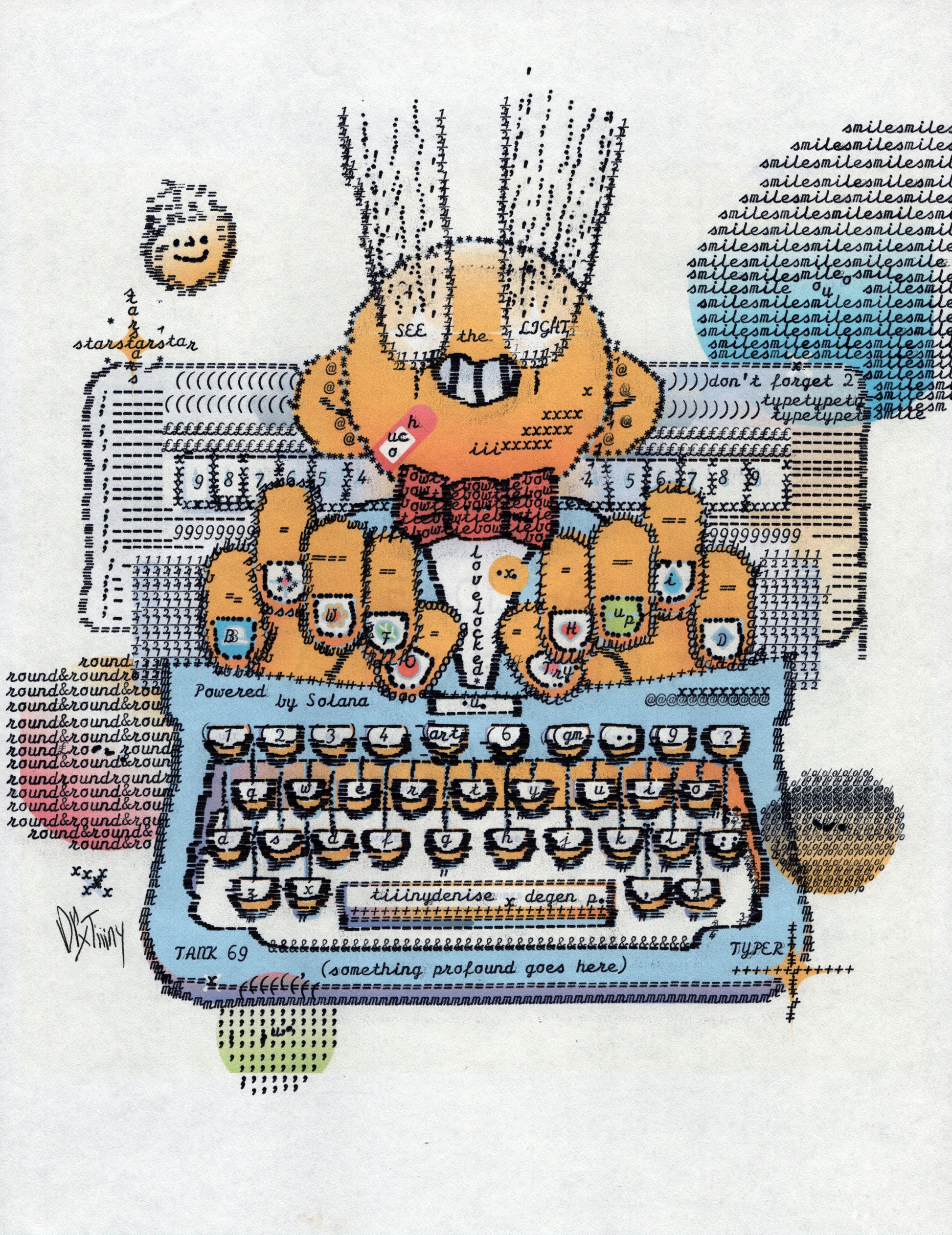 Includes the original typewriter artwork used to create an NFT on Solana. Crafted on a vintage typewriter, it shows platen wear, hammer indentations, and a signature by Degen Poet.